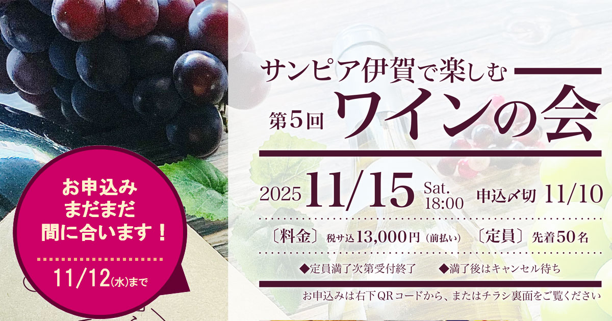 - サンピア特製おせち、ご予約開始しました(9月30日)伊賀の恵みを盛り込んだ特製おせちをお届けします。早期予約特典、直接引取特典で最大2,000円割引!