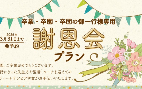 お世話になった先生方や監督・コーチを迎えてのパーティーをサンピア伊賀がお手伝いいたします。ソフトドリンク飲み放題付きで、お一人様税サ込3,500円~。